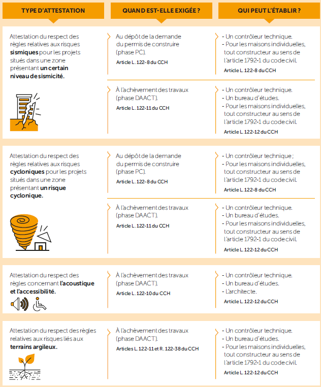 Les professionnels compétents pour établir les attestations sont le contrôleur technique, le bureau d’études ou tout constructeur au sens des dispositions de l’article 1792-1 du code civil.