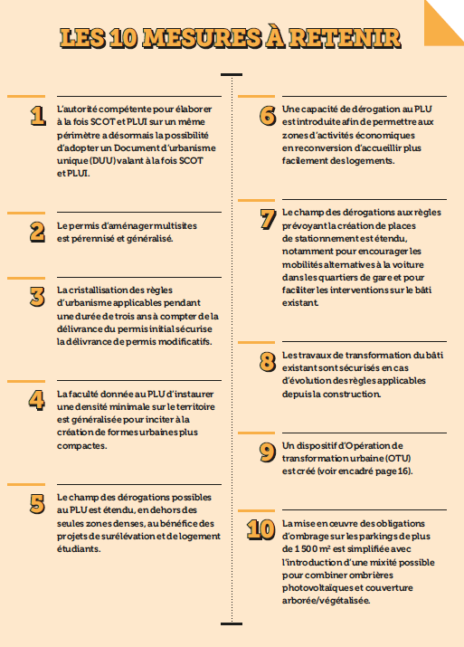 Les deux principaux axes sont : d’une part, aider les rédacteurs de SCOT et de PLU à adapter les documents d’urbanisme pour faire de la place aux nouveaux programmes de logements, et cela tout en tenant compte de la mise en place progressive du Zéro artificialisation net (ZAN)1 ; et d’autre part, faciliter la délivrance des autorisations de construire.
