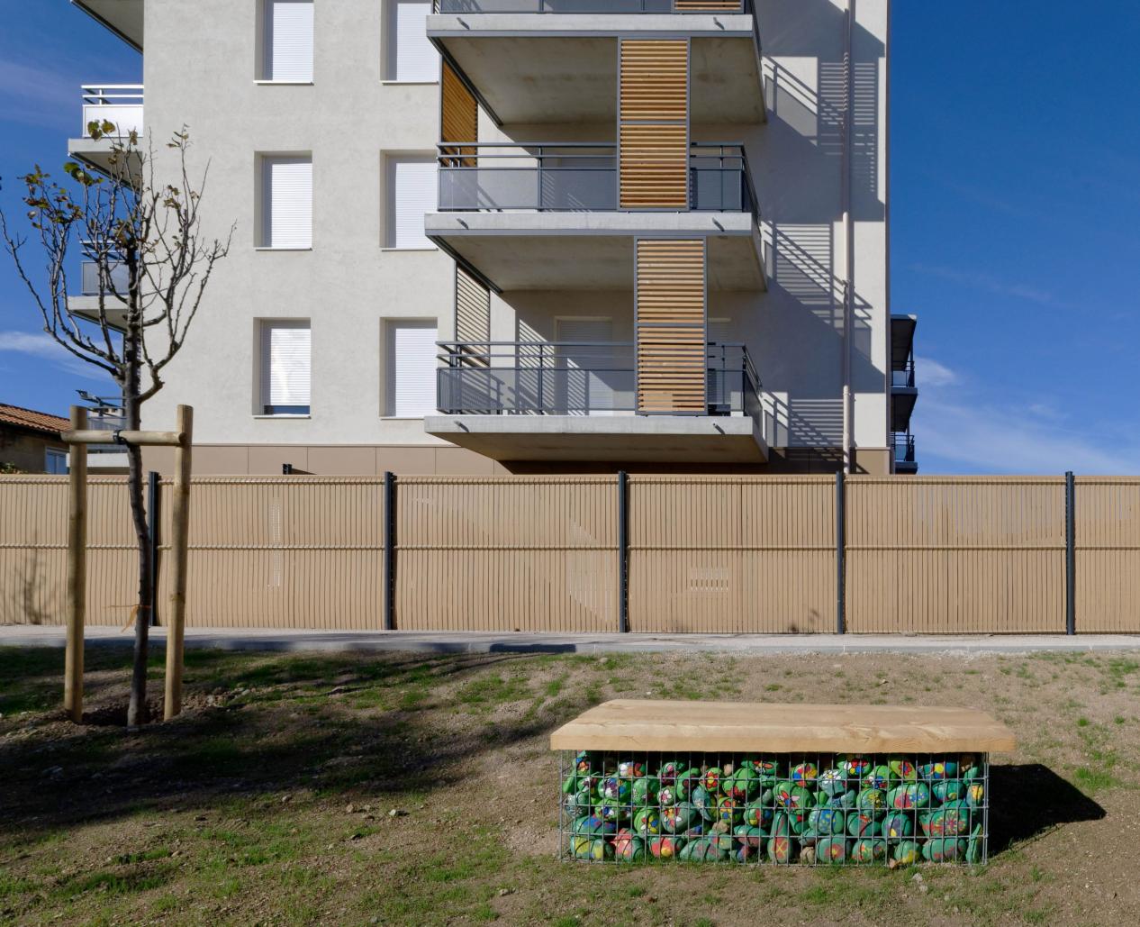 Au cours d’ateliers avec les habitants, une idée est née : faire peindre par les élèves, les pierres et les galets trouvés pendant la déconstruction et les intégrer en tant que mobilier urbain du futur parvis.